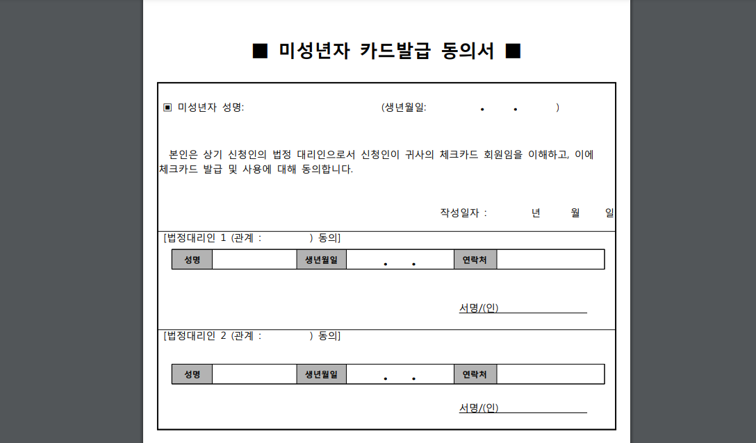 아래의 이미지는 SC제일은행에서 안내되고 있는 법정대리인 발급동의서입니다. 예시로써 이미지와 파일을 첨부드리며, 방문하는 은행의 영업점에 문의를 진행하여 발급동의서의 필요여부 혹은 발급 방법을 확인하는 것을 권장드립니다.