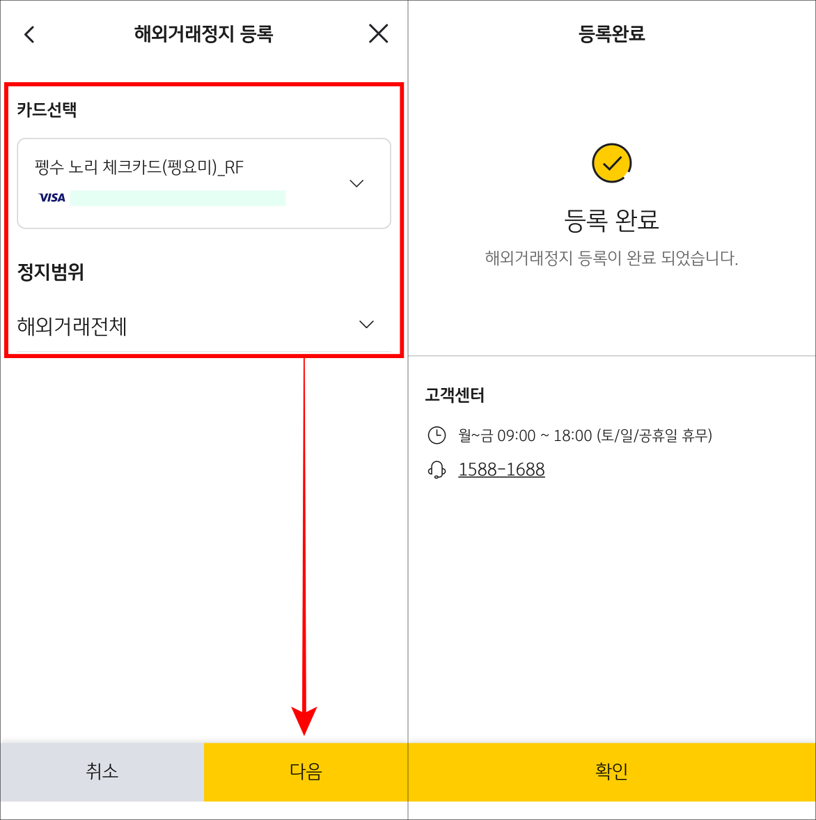 4. 접속된 페이지에서 해외결제를 차단할 카드를 선택하고, 정지범위를 선택한 뒤, 다음을 선택하여 등록을 완료해 주세요.