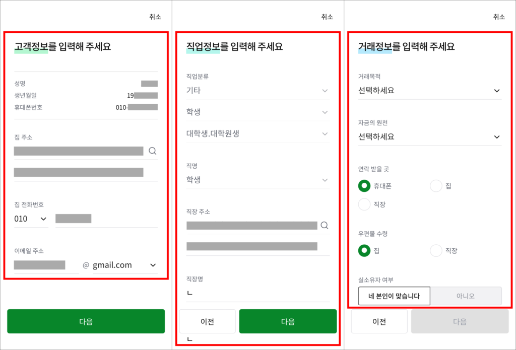 5. 고객정보와 직업정보, 거래정보를 순서대로 입력해 주세요.