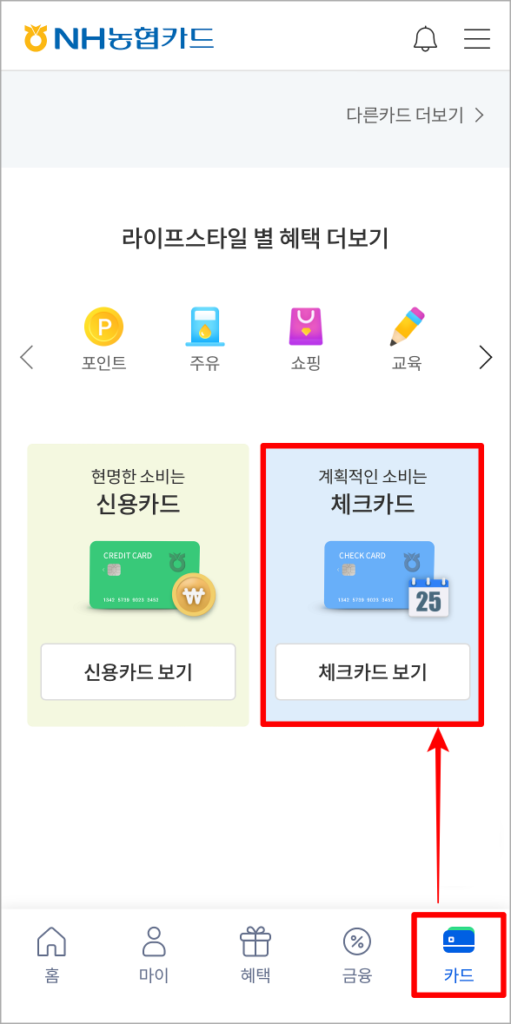 1. NH농협카드 앱에 접속한 뒤, ‘카드 탭’으로 접속하고, 접속된 페이지에서 ‘체크카드 보기’를 선택해 주세요.