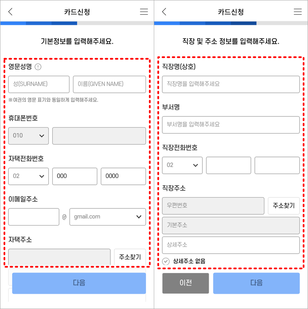 4. 영문성명과 휴대폰번호와 같은 본인의 기본정보를 입력하고, 직장의 정보를 입력해 주세요.