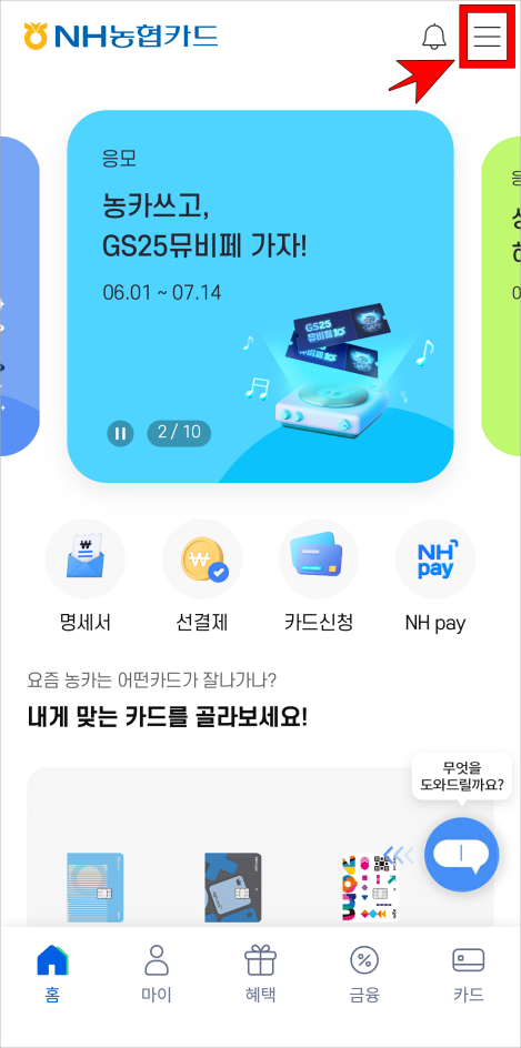 1. 농협카드 앱에 접속하고 상단의 버튼을 선택하여 전체 메뉴로 진입합니다.