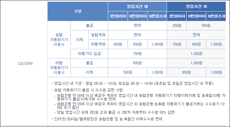 농협 ATM에 대한 출금 수수료는 농협카드를 기준으로 하고 있는데요. 간단히 이용하는 ATM이 비치된 영업점의 운영시간에 출금을 진행하는 가, 혹은 운영시간 이외의 시간에 출금을 진행하는 가에 따라 수수료를 구분할 수 있습니다.