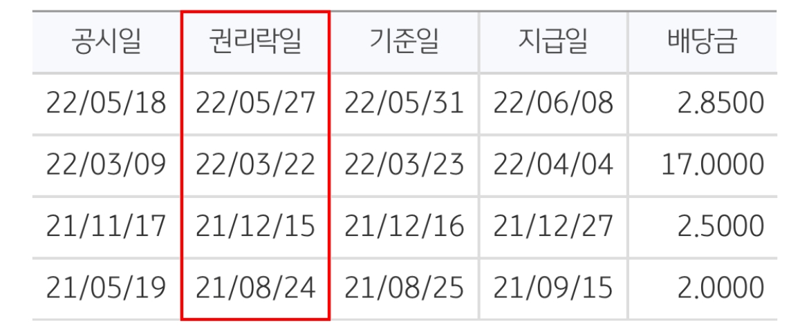 배당금을 지급해주는 회사는 기본적으로 배당을 지급해주기 전 권리락 일과 지급일, 주 당 배당금을 공시해주고 있습니다. 여기서 우리가 배당을 받기 위해 보아야 할 부분은 권리락일입니다.
