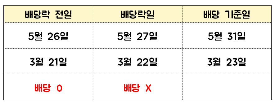 여기서 가장 중요하게 알고 있어야 할 부분은 배당 정보가 공시되었을 경우 배당락일 전 날까지 해당 주식을 매수해야 한다는 사실입니다.