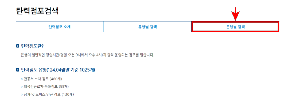 4. 탄력점포에 대한 내용을 확인하고 은행별 검색을 선택합니다.