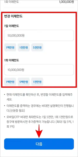 4. 현재 이체한도를 확인하고, 변경할 이체한도를 입력한 뒤, 다음을 선택합니다.