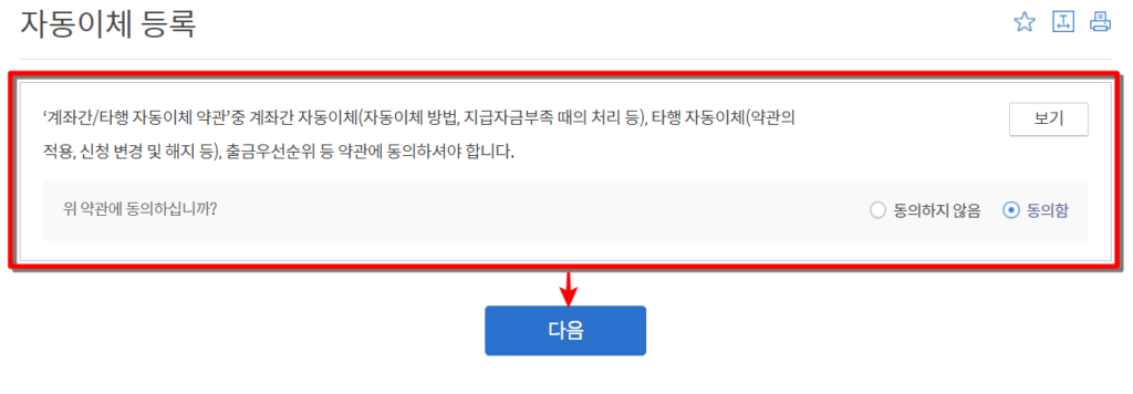 자동이체를 등록하기 위한 약관에 대하여 보기를 통해 확인하고, 동의를 진행한 뒤 다음을 눌러주세요.