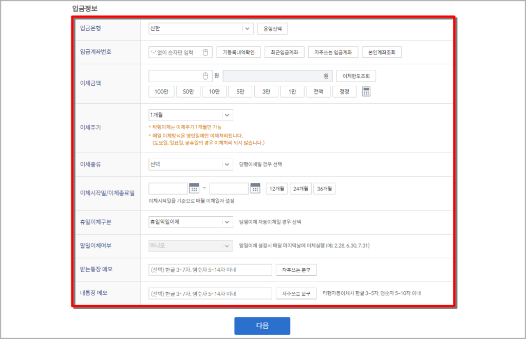 자동이체를 통해 입금될 은행의 계좌와 이체주기, 종료일 등을 설정하고 다음 버튼을 선택해 주세요. 자동이체에 대한 수수료는 무료이며, 타행에 대한 이체의 경우 한시적으로 수수료가 면제되고 있습니다.