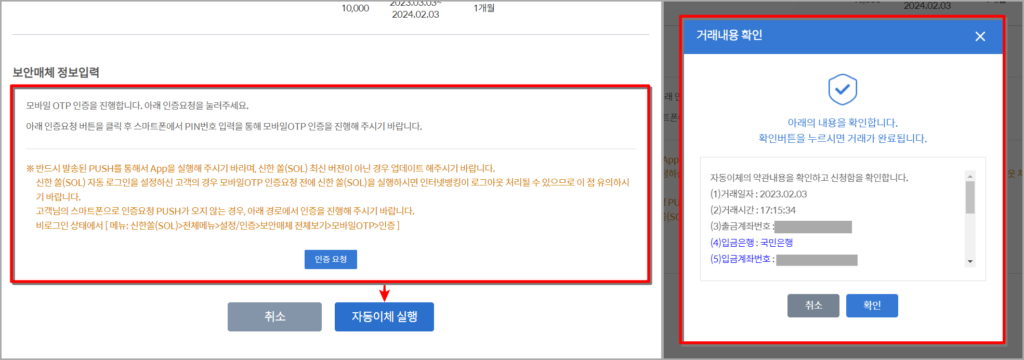 마지막으로 보유한 보안매체를 통해 인증을 진행하고 등록되는 자동이체의 정보를 확인한 뒤 등록을 완료해 주세요.