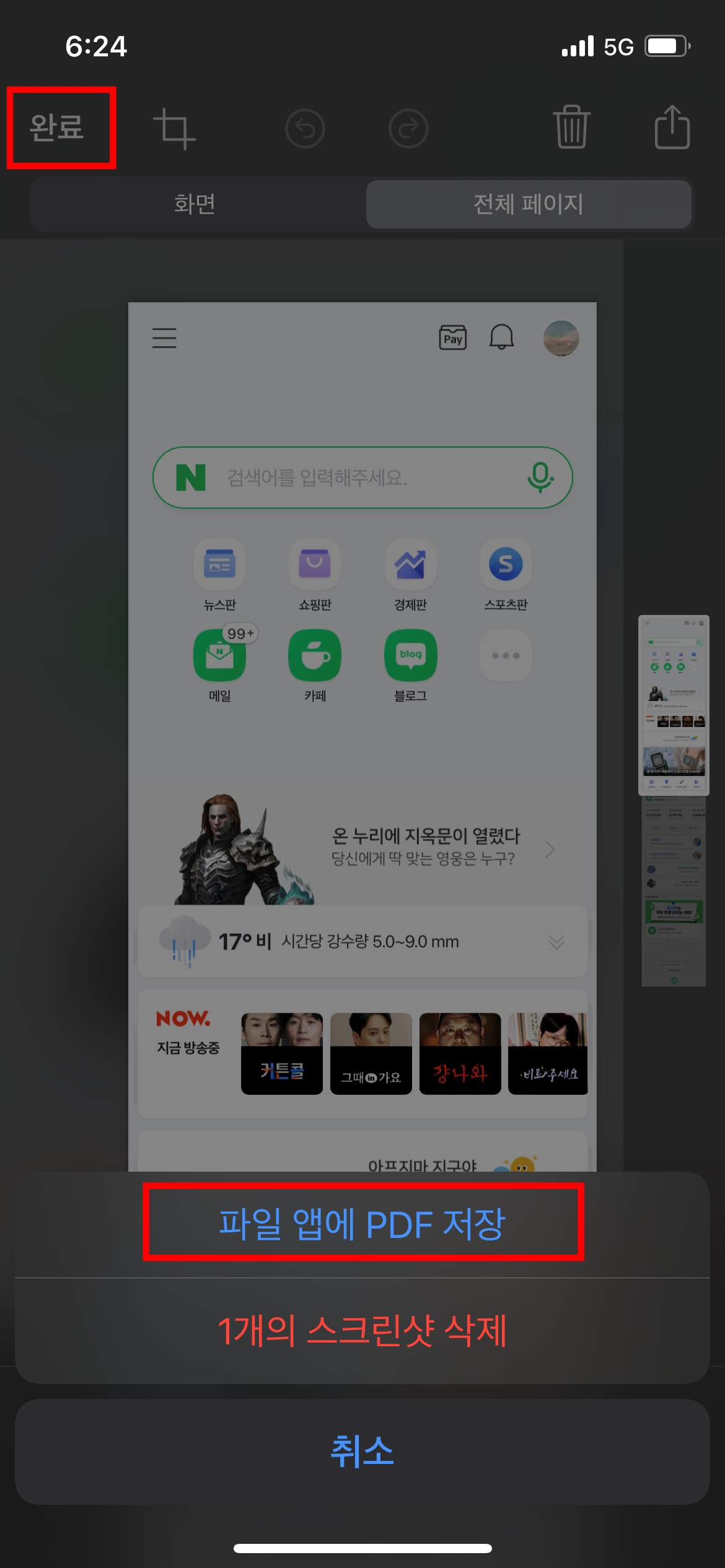 전체 페이지를 누르게되면 캡쳐를 진행했던 화면에 안 보이던 모든 페이지가 나오게 되고, 이제 원하시는 부분만 잘라서 저장을 따로 해주시거나 완료를 눌러 PDF파일로 저장 후 사용해주시면 됩니다!