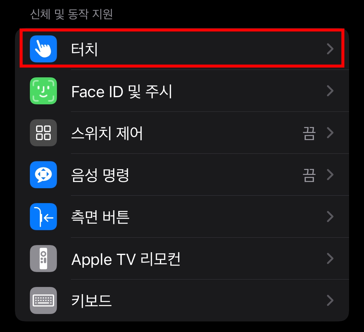 손쉬운 사용에 들어오셨으면 신체 및 동작 지원 부분의 터치로 들어가주세요!