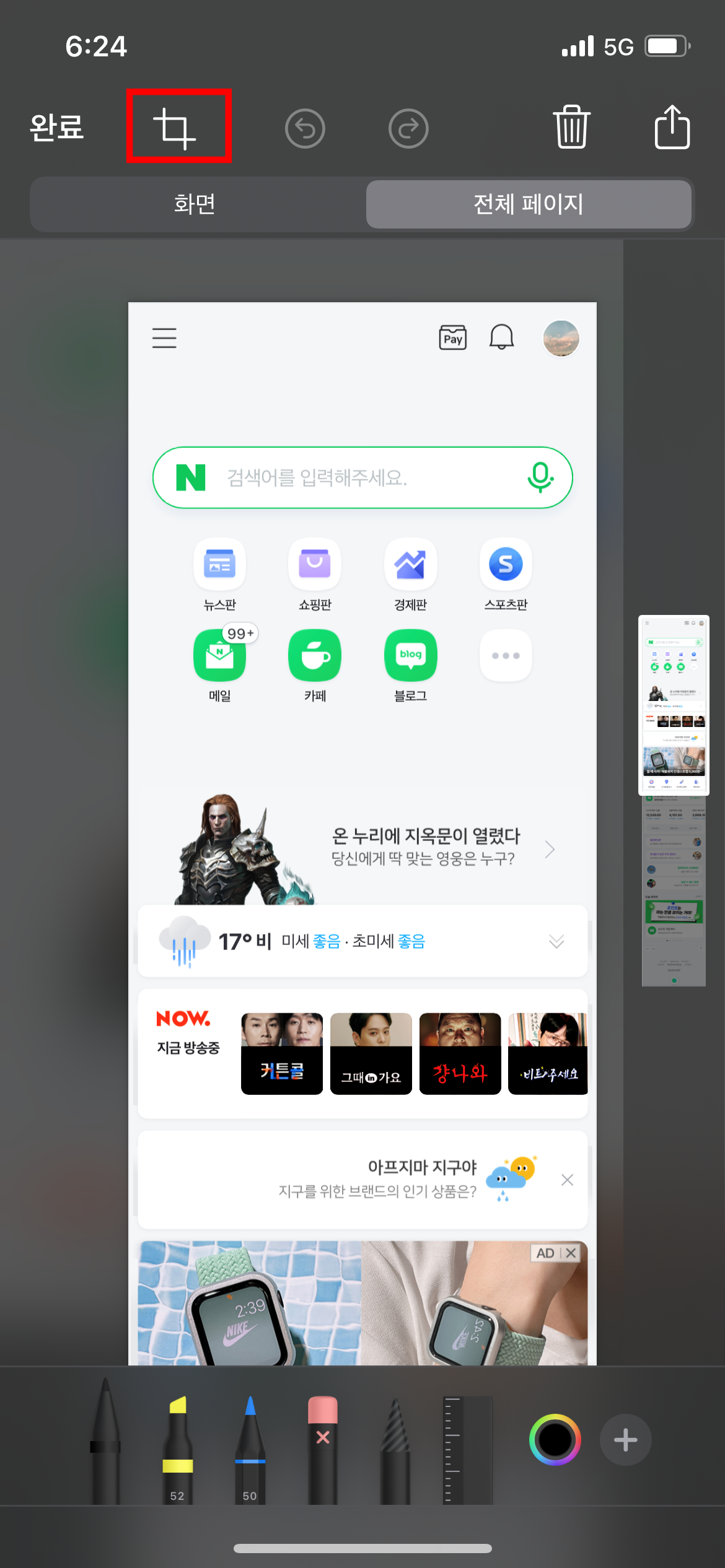 아이폰의 기본 캡쳐를 하게되면 좌측 하단에 작게 미리보기 화면이 나오게 됩니다. 그 화면을 누르면 위의 이미지처럼 화면이 뜨게 되는데 화면 상단에서 볼 수 있는 전체 페이지 버튼을 눌러주세요!