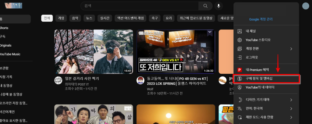 유튜브에 접속하여 로그인을 완료한 뒤, 프로필 메뉴를 선택해 주세요. 유튜브 프리미엄의 구독자라면 프로필 메뉴에 다음과 같이 프리미엄에 대한 관리 메뉴가 생성되며, 메뉴 중 구매 항목 및 멤버십을 선택해 주세요.