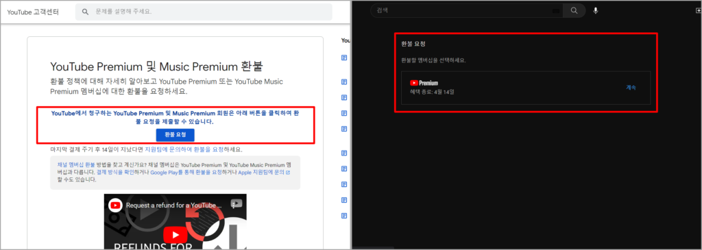 유튜브 고객센터에 접속하여 “유튜브 프리미엄 및 뮤직 프리미엄의 환불 안내”를 확인하고 환불 요청을 선택하게 되면, 유튜브를 통해 환불 메뉴로 접속되며, 해당되는 멤버십의 환불을 진행해 볼 수 있습니다.