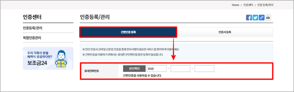 4. 접속된 인증등록/관리 페이지에서 간편인증 등록을 선택하고, 휴대전화번호를 확인한 뒤, 본인확인을 선택해 주세요.
