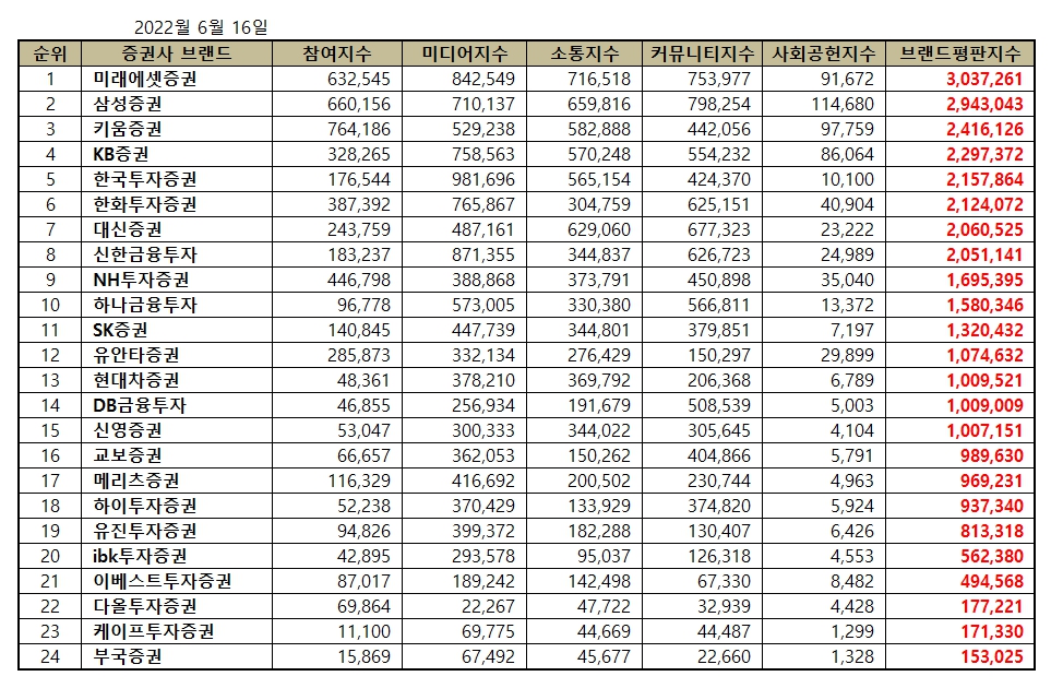 증권사는 투자자와 증권시장에서 증권을 매매하는 업무를 담당합니다. 위의 이미지는 한국기업평판연구소에서 정리한 2022년 6월 16일 기준의 증권사의 브랜드 평판 순위입니다. 평판 순위 기준, 1위 미래에셋증권, 2위 삼성증권, 3위는 키움증권으로 실제로 국내에서 가장 많이 사용하는 증권회사는 키움증권입니다.
