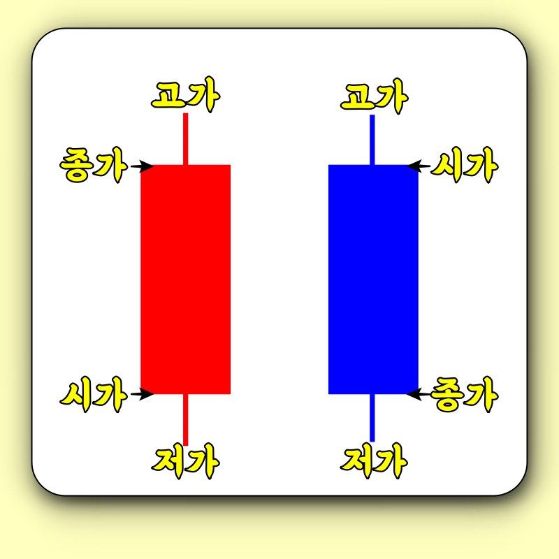 이 반대로 파란색의 음봉은 주가의 하락을 보여주는 봉이니 몸통 가장 위의 부분을 시가, 잠시 상승해줬으나 꼬리를 생성하고 떨어진 부분을 고가, 쭉 떨어져 줬으나 다시 약간의 되돌림을 보여줘 마무리된 부분을 종가, 쭉 떨어져준 부분을 저가라고 칭합니다.
