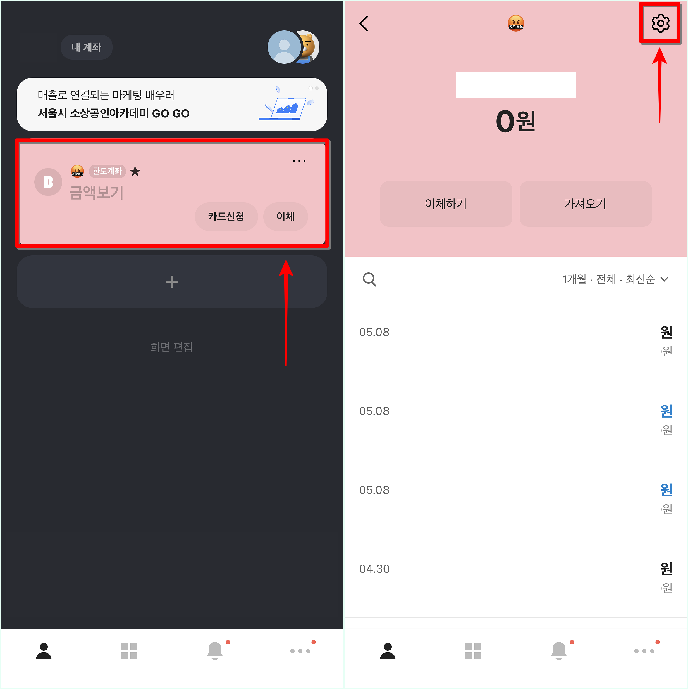카카오뱅크로 접속하였다면 모임통장으로 사용할 입출금통장을 선택하고, 계좌내역 상단의 톱니바퀴 버튼을 선택하여 계좌관리로 접속해 주세요.