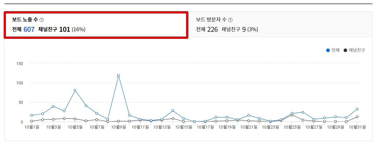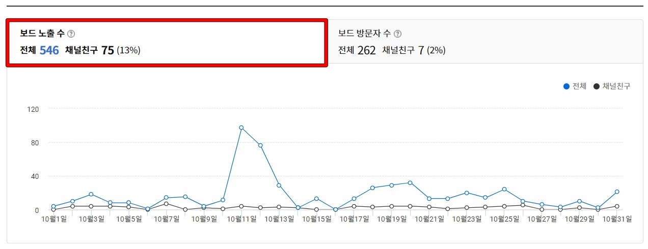 필자의 경우 현재 10월과 동일하게 하루에 한개의 보드만 발행하는 방식으로 운영하고 있으며 품앗이로 성장시킨 4개의 채널외에 하나의 채널을 새로 만들어 노출과 친구에 관한 새로운 테스트를 진행하고 있습니다. 아직까지 유의미한 결과가 없지만 공유할만한 결과가 나온다면 공유해보도록 하겠습니다.