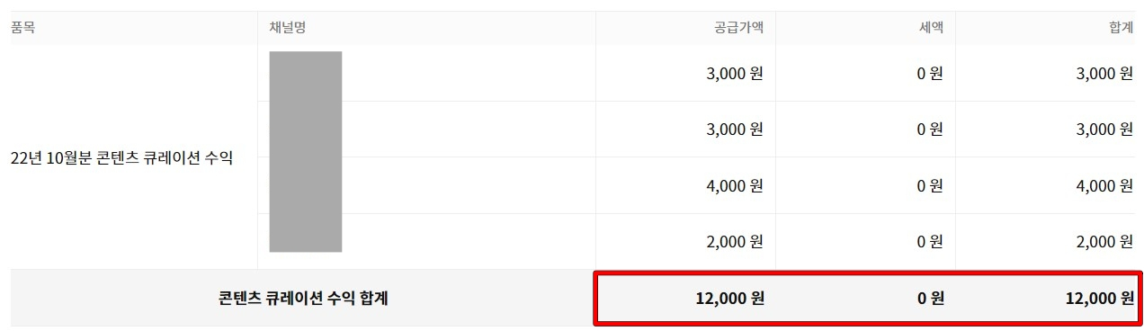 기존에 수익 기준이 통과된 4개의 채널에서 총 1만 2천원의 수익이 발생했으며, 9월과 비교하였을 때는 30% 수준으로 하락하였지만 노출수가 줄어든것에 비해 나쁘지 않은 수준으로 생각하고 있습니다.