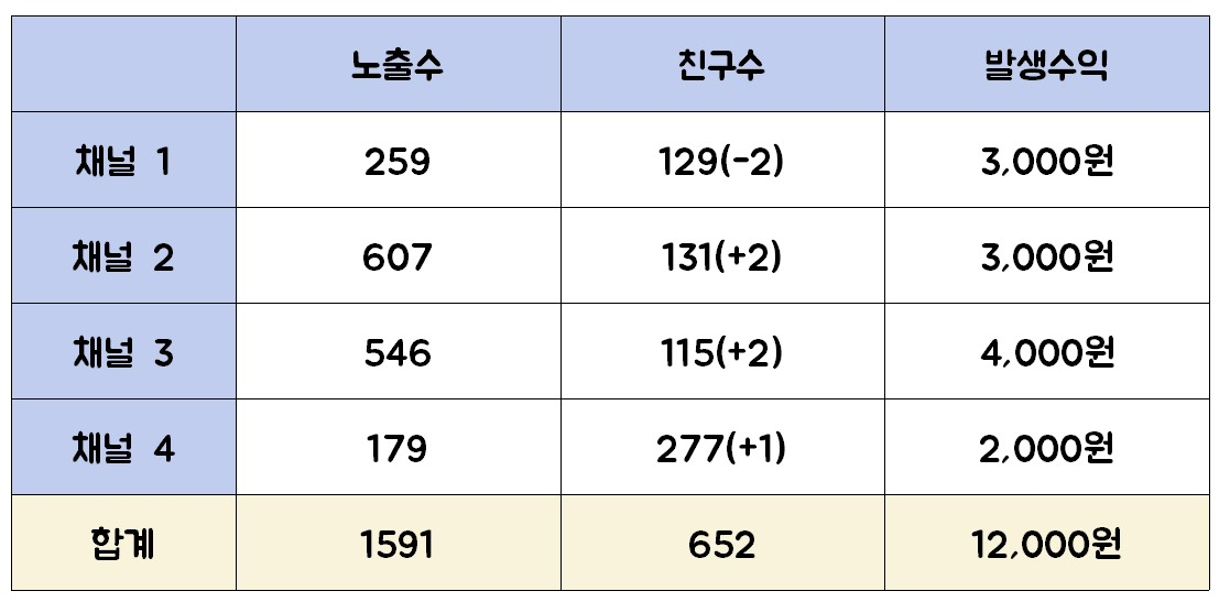 마지막으로 수익이 정산된 4개의 채널의 10월 현황을 모아보면 다음과 같습니다. 사실 친구수가 큰 의미가 있는지는 모르겠지만 더 이상의 품앗이는 진행하고 있지 않기 때문에 친구가 늘어난 경우 자연스럽게 유입되어 증가된 친구수입니다.