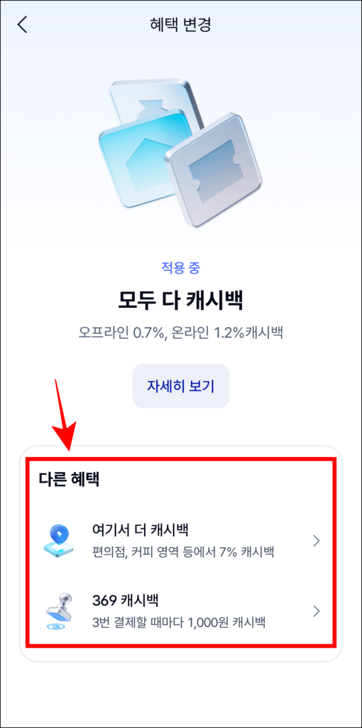 - 모두 다 캐시백: 금액, 가맹점, 횟수와 관계없이 오프라인 0.7%, 온라인 1.2% 캐시백