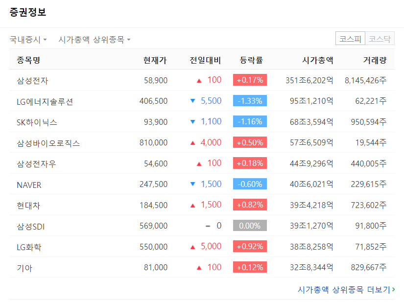 현재까지 코스피에는 821개의 회사에서 941개의 종목이 상장되어 있습니다. 마지막으로 코스피 시장을 시가총액 순위로 보게 되면 아래와 같습니다.