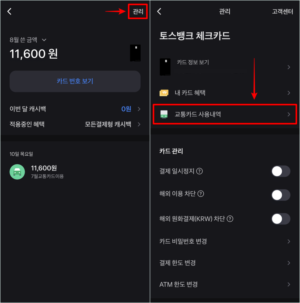 토스뱅크 카드 메뉴로 접속되었다면 상단의 관리를 선택하여 접속해 준 뒤, 관리 메뉴 중 교통카드 사용내역을 선택해 주세요.