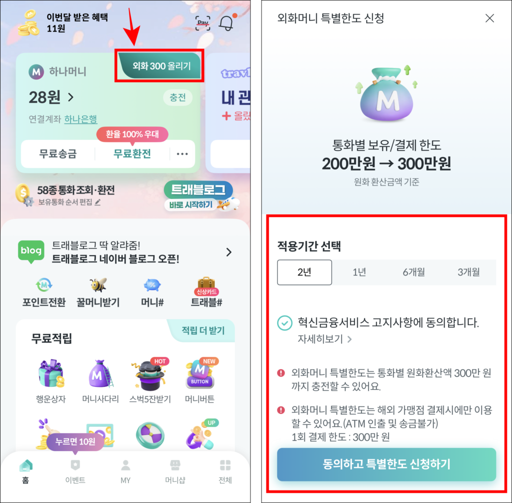※ 충전 한도 상향은 하나머니 앱에 접속한 후 홈 화면에 표시되는 하나머니의 ‘외화 300 올리기’를 선택하거나, 전체 메뉴에서 ‘외화 충전/결제 한도 UP’ 메뉴로 접속하여 신청이 가능합니다.