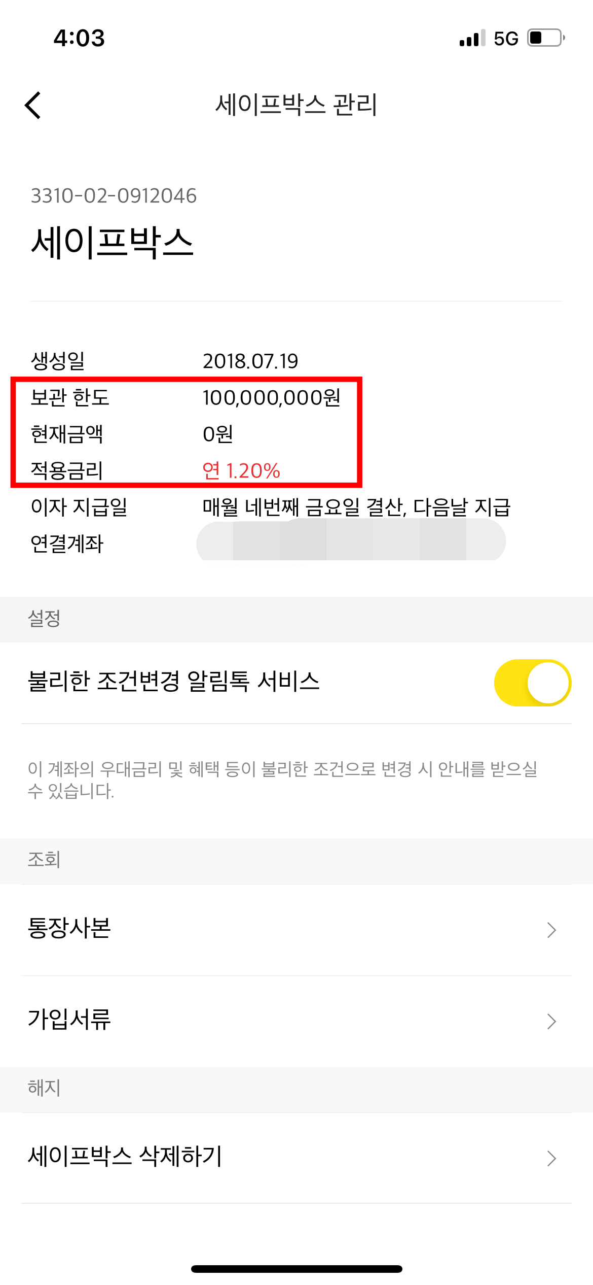 파킹통장이란 개념이 이 세이프박스로 인해 많이 알려진 만큼 세이프박스는 많은 분들이 이용을 하고 계실 것으로 예상이 되는데, 처음에는 지금과 동일한 1.2%의 금리를 제공하다가 초기에 경쟁 상대가 없다 보니 0.5%까지 금리를 낮추기도 했었지만 토스와 다른 저축은행들의 성장 덕분에 현재는 최대 1억 원까지 보관이 가능하며 카카오뱅크의 계좌 하나당 세이프박스를 하나씩 생성해줄 수 있습니다.