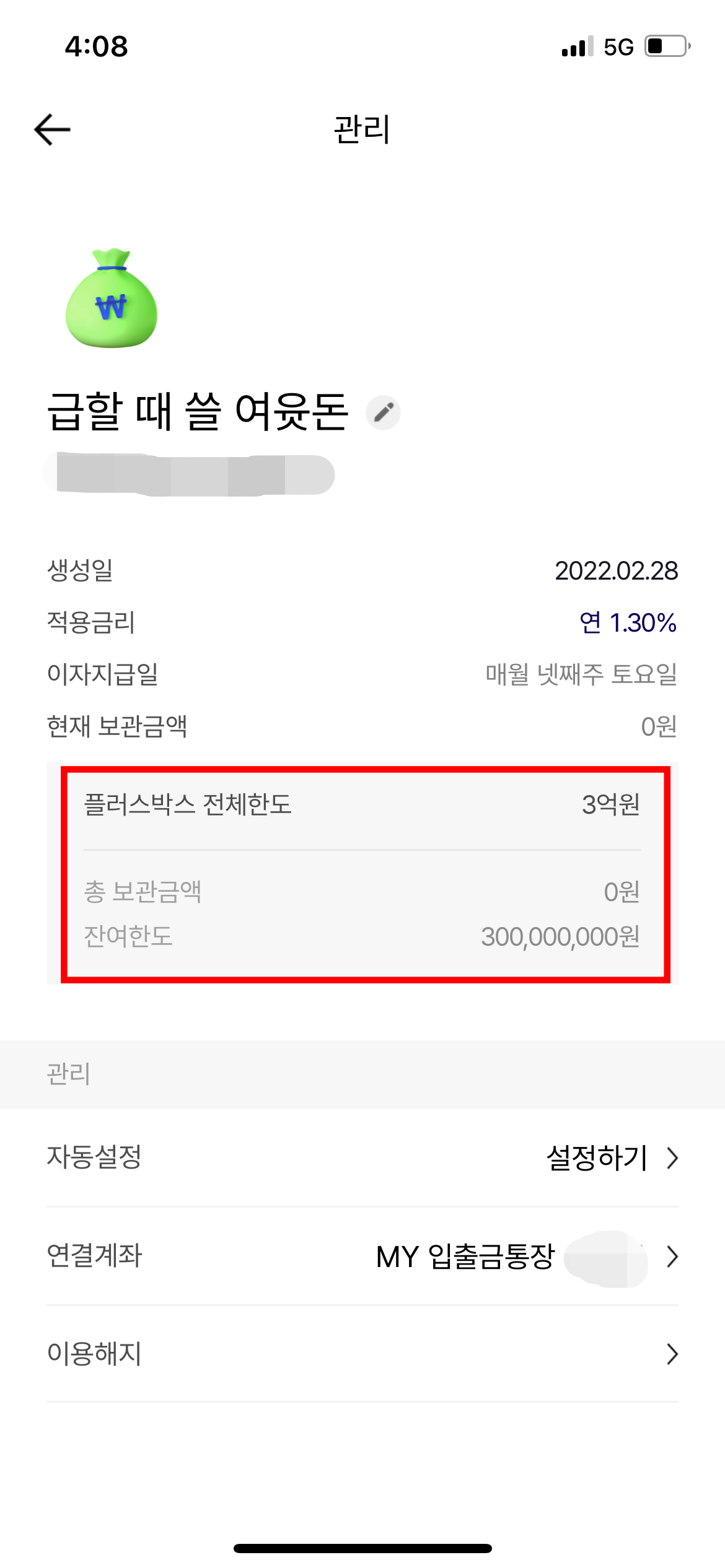 세이프박스와 동일하게 수시로 입출금이 가능하지만 이름 그대로 잔돈을 저금하기 위해 만들어진 통장으로 최대 10만 원의 금액만 파킹이 가능합니다. 또 자동으로 출금이 되도록 설정이 가능해 카카오뱅크가 주 거래은행이라면 사용해 볼만한 기능이라고 생각이 듭니다.