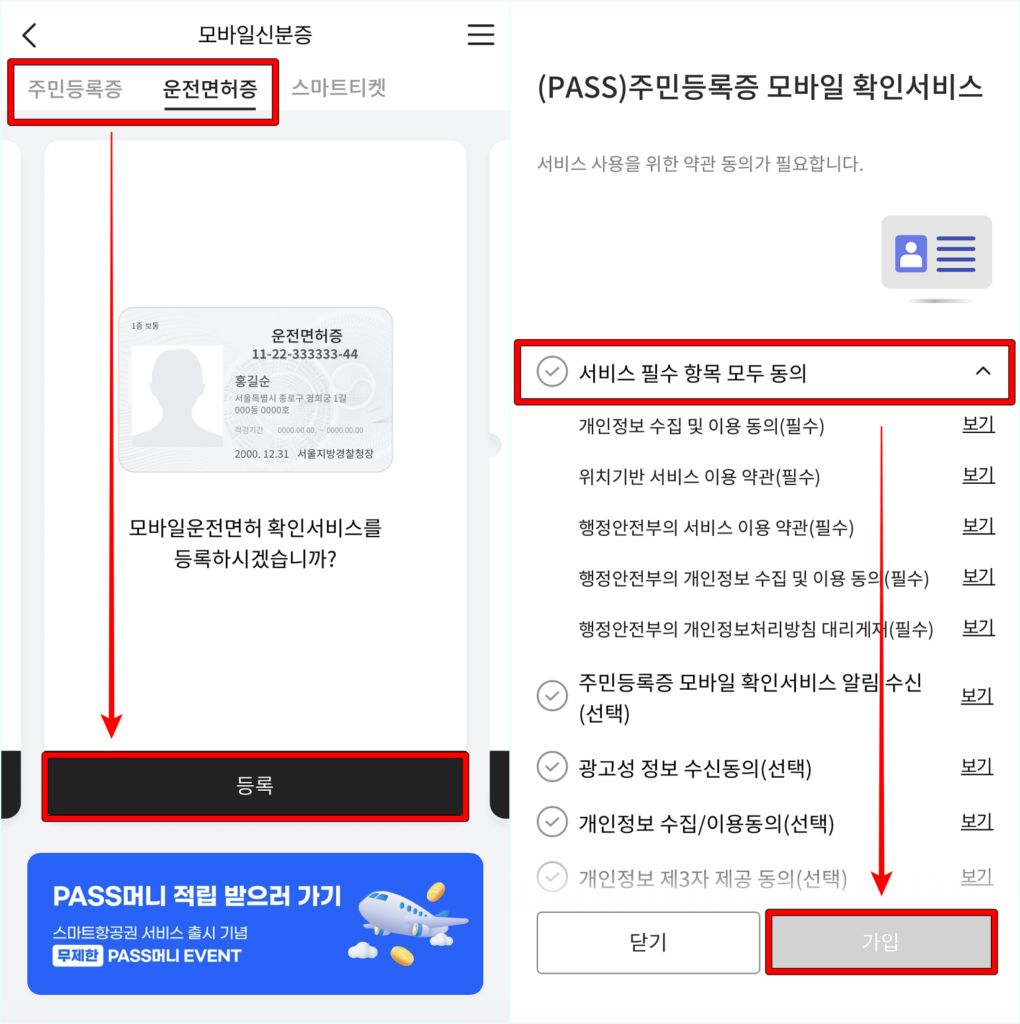 주민등록증과 운전면허증 중 모바일 신분증으로 등록할 신분증의 종류를 선택한 뒤, 서비스 이용에 대한 필수 항목(필요시 선택 항목 포함)에 동의하고 가입을 진행해 주세요.