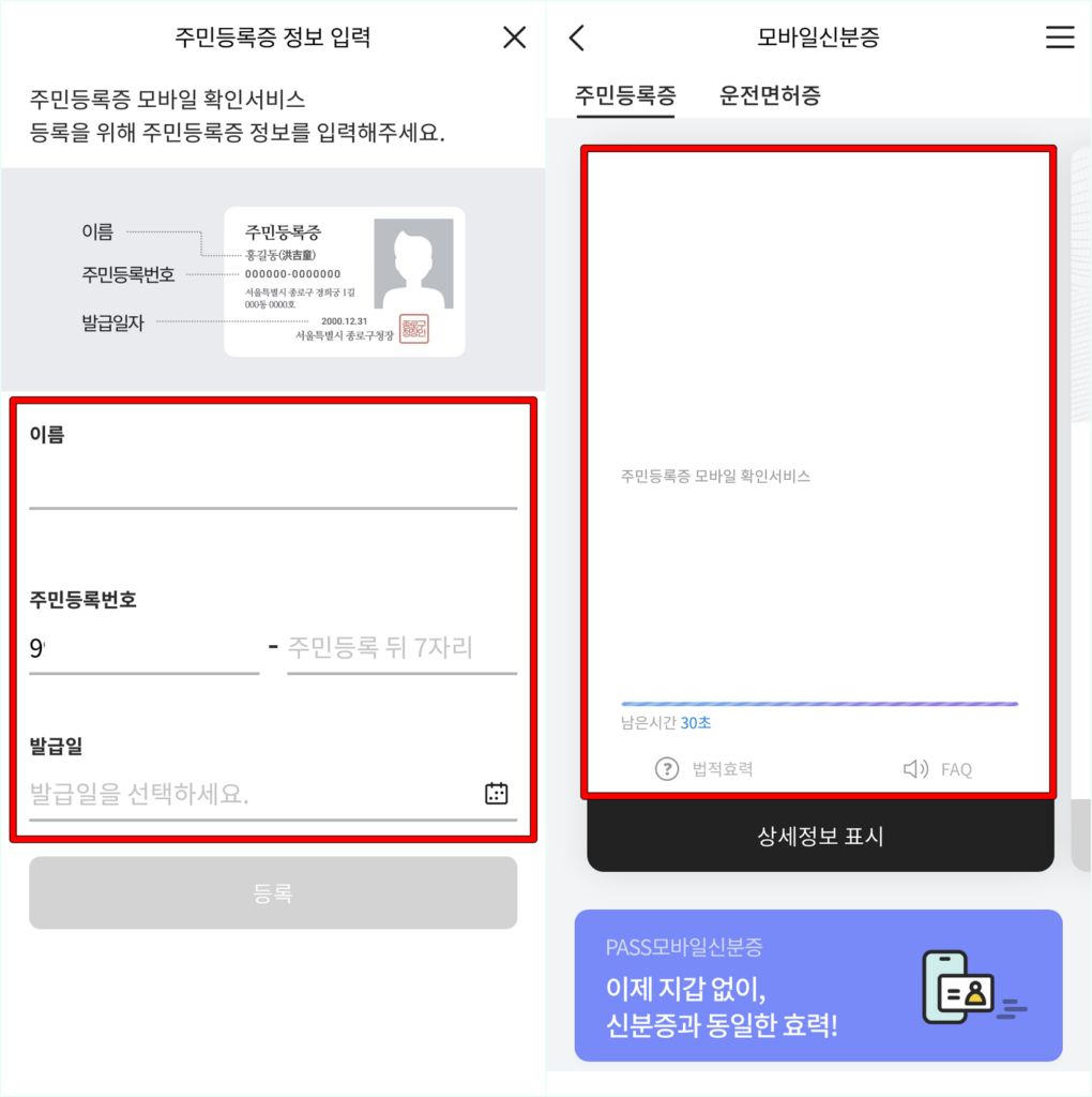 마지막으로 신분증의 정보를 입력하여 모바일 신분증 등록을 완료해 주세요. 주민등록증의 경우 정보 입력을 기준으로 하지만, 운전면허증의 경우 촬영을 통한 정보 인식이 지원됩니다.
