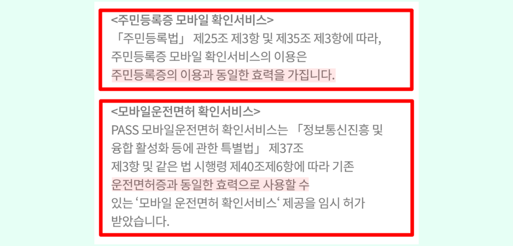 하지만 해당 글을 통해 알아보고 있는 모바일 신분증의 경우 모바일을 통해 신분확인과 성인인증 등을 진행할 수 있도록 서비스가 제공되고 있기 때문에 각각 주민등록법과 정보통신진흥 및 활성화 등에 관한 특별법에 따라 기존 신분증과 동일한 효력으로 사용이 가능합니다.