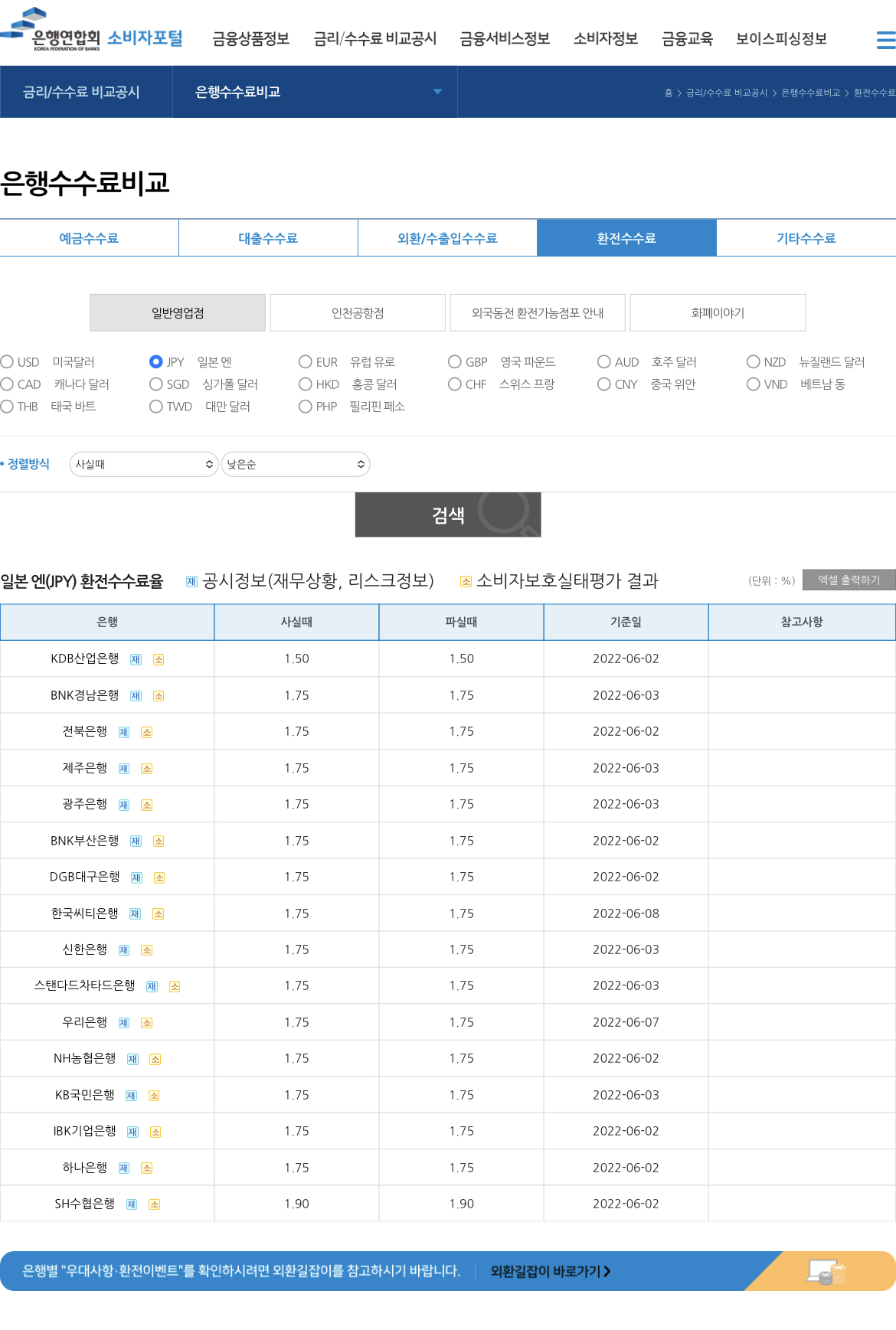 위에서 말씀드린 세가지 방법 외에도 환율을 추종하는 ETF에 투자하는 방법 등이 있습니다. 가장 자신에게 적합한 방법으로 시작해보시길 추천드리고 마지막으로 시중은행들의 환전 수수료를 비교해 볼 수 있는 홈페이지인 전국 은행 연합회(www.kfb.or.kr)를 소개 드리도록 하겠습니다. 은행 연합회에서는 기준일에 따라 살때와 팔때의 수수료를 비교해주고 있습니다.