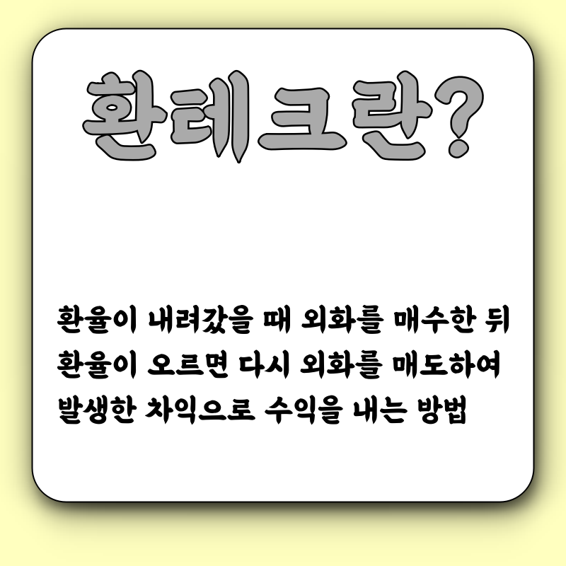 환테크는 환율과 재테크가 합쳐진 단어로, 기본적으로 환율의 변동성을 예상하여 투자를 진행하고 환율이 내려갔을 때는 외화를 매수 한 뒤 환율이 올라가면 다시 외화를 매도하여 이 때 발생한 차익으로 수익을 내는 재테크 방법입니다.