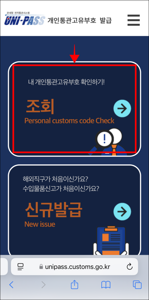 2. 개인통관고유부호 발급 페이지 화면의 ‘조회’를 선택합니다.