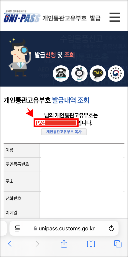 4. 조회된 개인통관고유부호를 확인합니다.