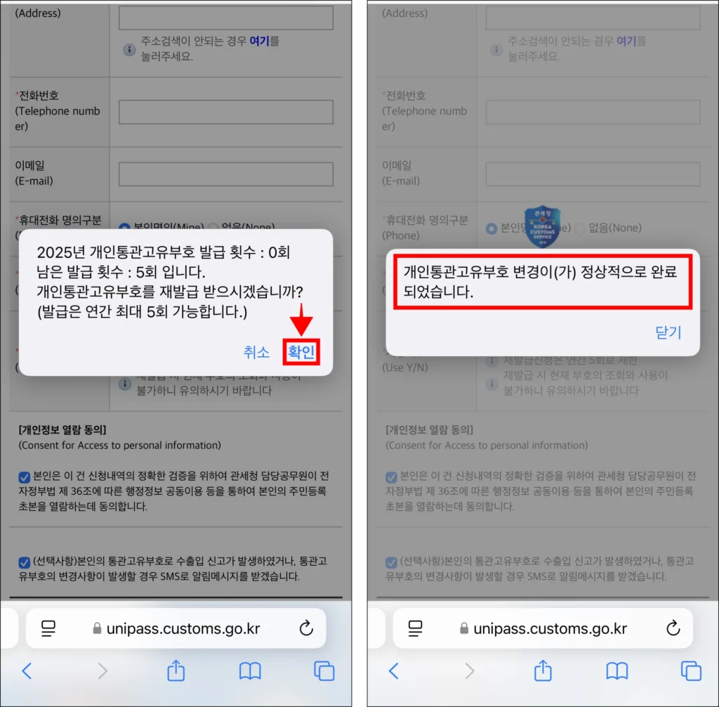 마지막으로 화면에 표시된 안내사항의 확인을 선택하면 개인통관고유부호가 재발급되어 새로운 번호로 변경됩니다.