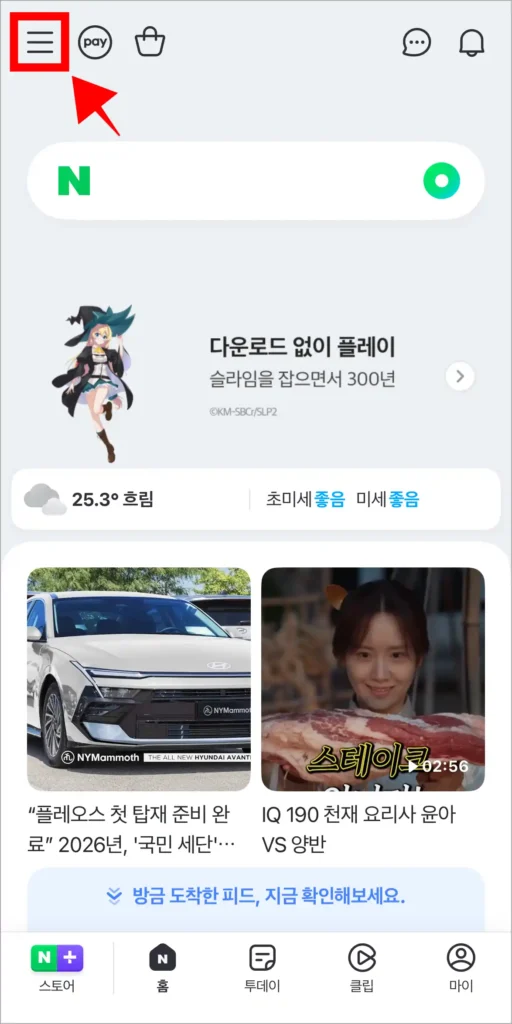 1. 네이버에 접속한 후 로그인을 진행하고, 화면 좌측 상단의 바로가기(≡) 버튼을 선택합니다.