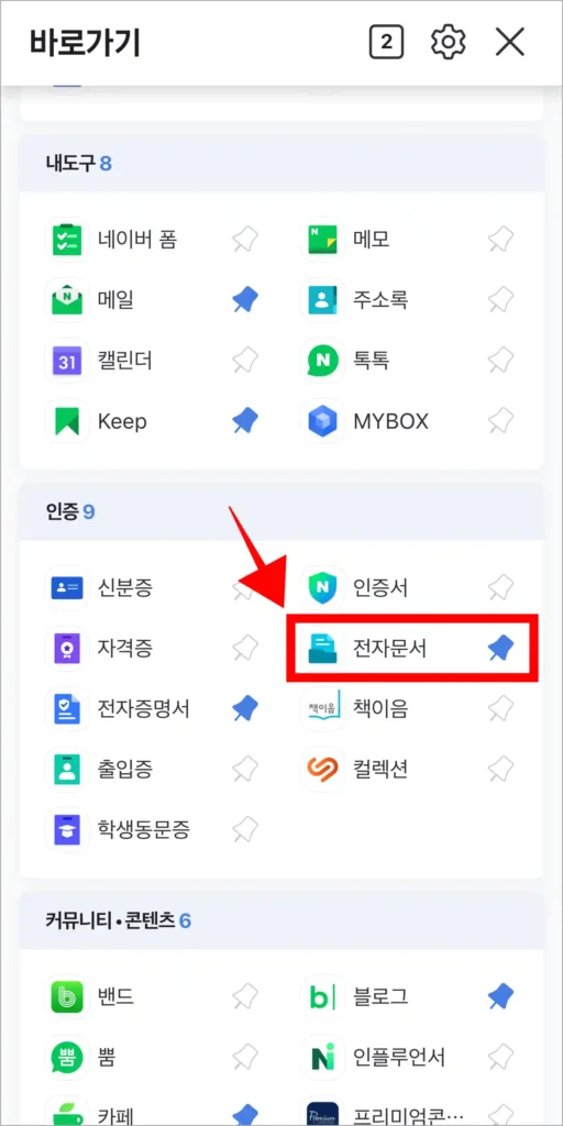 2. 바로가기 메뉴 중 인증 메뉴의 ‘전자문서’를 선택합니다.