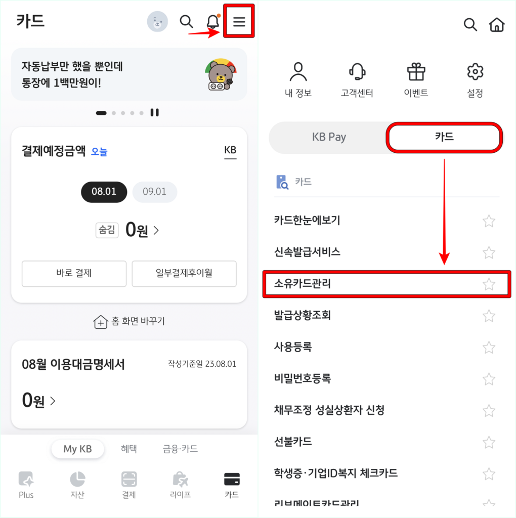 KB PAY 앱에 접속하였다면 상단의 버튼을 선택하여 전체 메뉴로 접속하고, 카드 메뉴를 선택한 뒤, 소유카드관리를 선택하여 접속해 주세요.