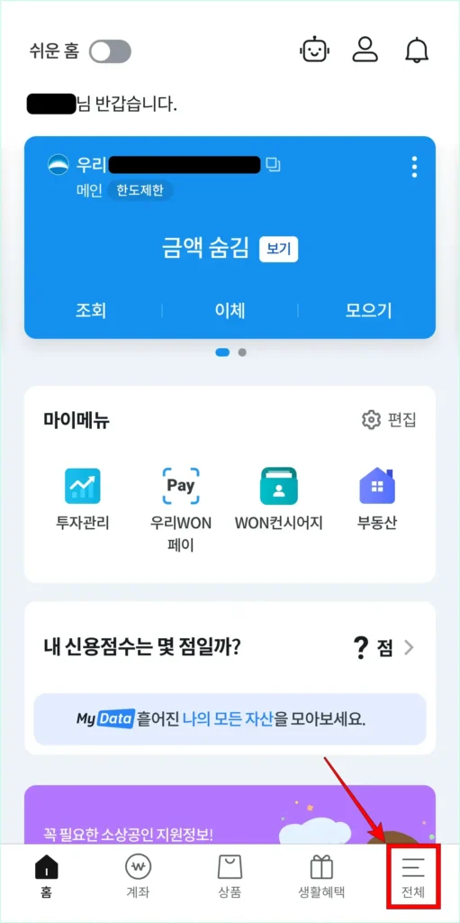 2. 앱 화면 하단의 ‘전체’를 선택하여 전체 메뉴로 접속합니다.
