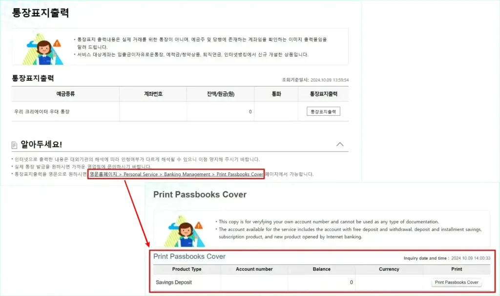 이때 PC에서는 우리은행 홈페이지의 통장표지 출력 메뉴로 접속하여 다음과 같이 안내사항의 영문 통장표지 출력 메뉴로 접속할 수 있는 경로를 선택하면 즉시 영문 홈페이지의 통장표지 출력 메뉴로 접속되고, 해당 화면에서 계좌 우측의 ‘Print Passbooks Cover’ 버튼을 선택하면 영문 통장사본을 출력할 수 있습니다.