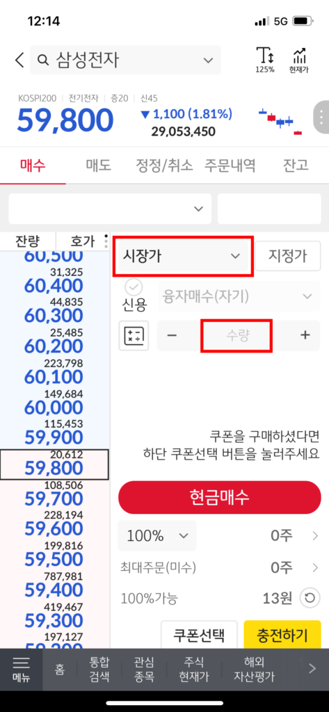 다음은 시장가입니다. 시장가는 말그대로 시장의 주가, 주식의 현재 가격으로 매수 또는 매도를 하는 방법입니다. 예측 하기 힘든 큰 하락이나 상승이 나왔을 때 빠르게 단기적인 거래를 할 때 이용하는 방법입니다.