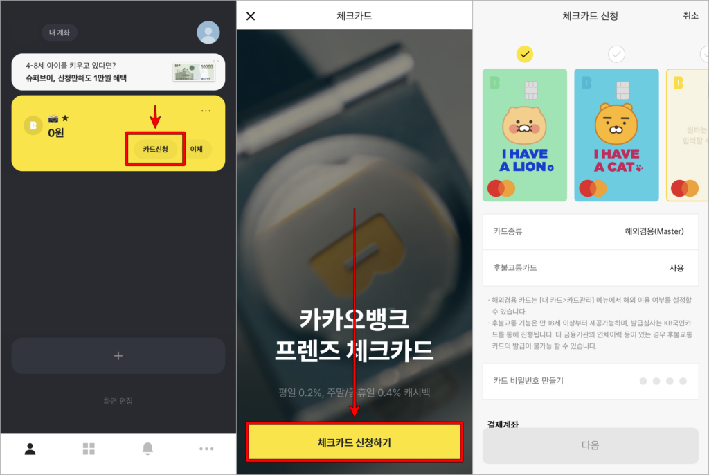 카카오뱅크의 체크카드는 카카오뱅크에서 계좌를 개설하여 보유하고 있다면, 발급받아볼 수 있는데요. 간단하게 다음과 같이 홈화면의 “카드 신청”을 선택하여 발급을 시작하고 디자인을 선택할 수 있습니다.