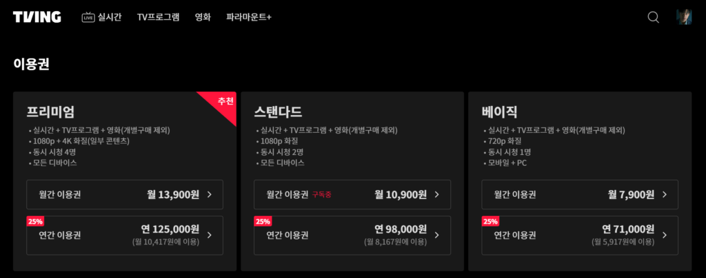 티빙 이용권 요금제