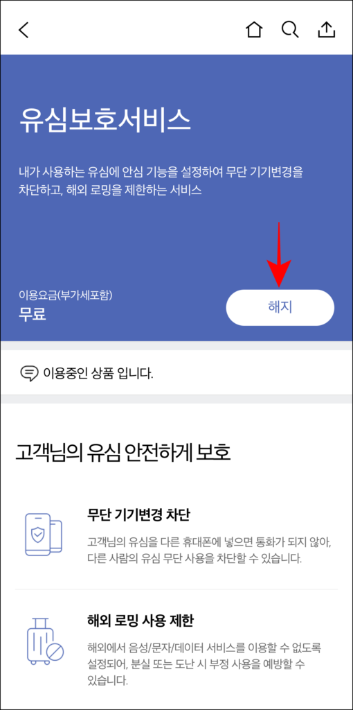 유심보호서비스는 앞서 설명한 것처럼 유심이 다른 기기에 장착되었을 때 통화 기능이 차단된다는 특징과 해외 로밍을 이용할 때 통화와 문자, 데이터 기능이 차단된다는 특징이 있기 때문에 실제로 본인이 유심을 다른 기기에 장착해야 하거나 해외 로밍을 이용해야 할 때는 유심보호서비스를 해지해야 하는데요.